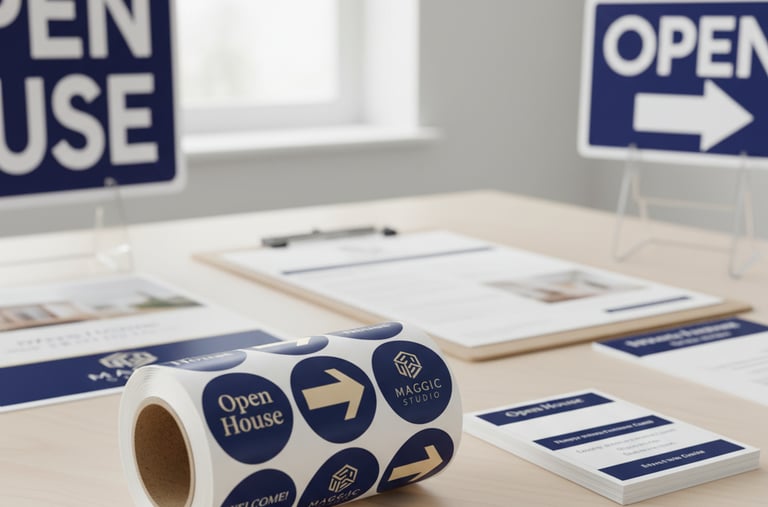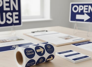 Custom design and printing of branded stickers and signage for open house directional use, property labels, or "thank you" bags.