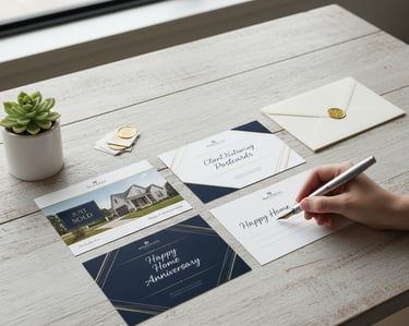Templated design and print coordination for seasonal or "Just Sold" postcards used for community farming and client follow-up.